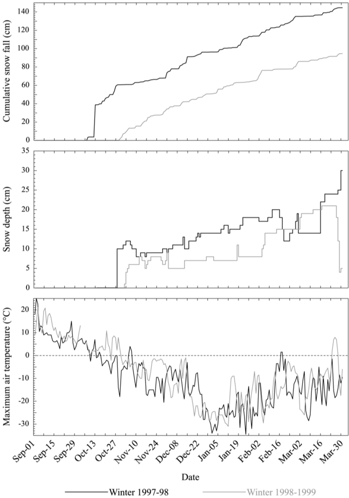The cumulative snowfall, snow depth, and maximum air temperature observed at the Churchill Airport weather station from 1 September to 30 March, 1997/98 and 1998/99.
