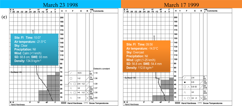 The snow stratigraphic profiles in the (a) sedge fen area (SI), (b) transition zone (T) and (c) open coniferous forest (FI), which are coincident with the RADARSAT-1 overpasses at the time of peak snow accumulation during the winters of 1997/98 and 1998/99.