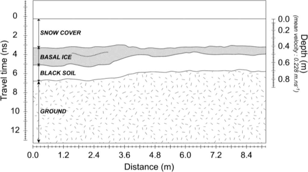 A PulseEkko 1000 ground-penetrating radar (GPR) instrument was also used to image the subsurface and the interior of the snow pack. GPR operates with a set of antennas: the first transmits successive radar impulses that are reflected by the dielectric discontinuities between the snow pack and the subsurface, and the second receives the signal that is reflected back toward the (snow) surface. The antennas are positioned in a fiberglass box and connected with coaxial cables to a control unit that digitizes the electric signals recorded by the receiving antenna. The control unit amplifies, processes, and then stores the information received by the antenna; examples of such information are the travel time between the transmitted and reflected signal and the amplitude and frequency of the reflected radar waves. A more thorough description of GPR can be found in [31]. In the vicinity of the six snow sampling sites, we conducted two types of GPR surveys: reflection profiling and common mid-point (CMP) velocity sounding. In the reflection profiling mode, the transmitting and receiving antennas were attached relative to each other with a constant separation of 15 cm and were then moved manually along a transect 9 m in length. We then obtained a profile showing the temporal location of the radar echoes as a function of the distance surveyed on the ground. The CMP velocity sounding is the electromagnetic equivalent of the seismic profile. The transmitting and receiving antennas were moved away from each other in 1-cm increments while maintaining a common mid-point. The GPR data collected in CMP mode were used to estimate the signal velocity in the snow pack and the subsurface to convert the time scale of the GPR reflection profiles into a depth scale. The stratigraphic information from traditional snow profiles was used to identify and determine the depth of both the snow–ground interface and the various reflectors within the snow pack with a precision of approximately 2 cm. A detailed description of this experiment is reported in [32].