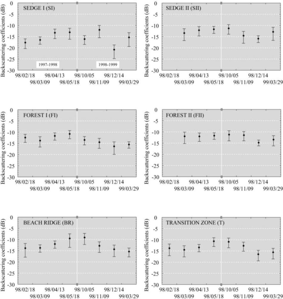 The ERS-2 seasonal backscatter signatures at six sampling sites. Shown are the maximum, mean, and minimum backscattering coefficients for a 5 ×5-pixel subset window.
