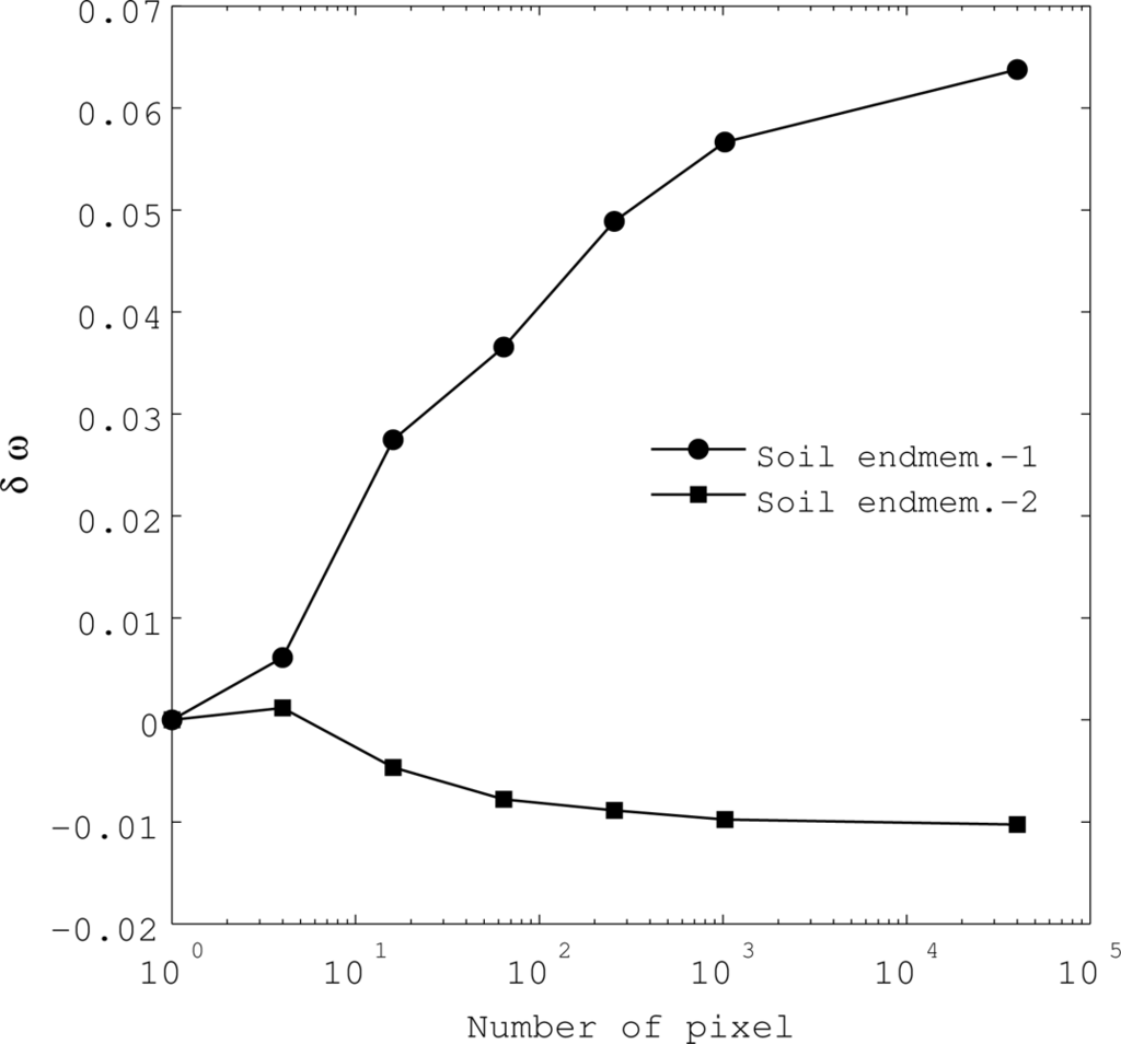 The relative differences obtained from the pair of spectra comprising the vegetation and soil endmem.-1 are indicated by the filled circles in Figure 3. The averaged FVC values as a function of the spatial resolution, for the soil endmem.-2, are indicated by the filled squares (Figure 3). Using the pair of vegetation and soil endmem.-1 spectra, the averaged FVC increased as a function of the number of pixels (coarser to finer). By contrast, the averaged FVC decreased when the spectral pair comprising the vegetation and soil endmem.-2 spectra was assumed in the algorithm. The results clearly indicate that the magnitude and trends (increasing or decreasing) of the scaling effects depend heavily on the endmember spectra assumed in the model. The scaling effects also depend on the endmember spectra reflected from the target area. The mechanism underlying the scaling effects observed in the calculated FVC has not been previously elucidated. The present study aims to address this very issue.