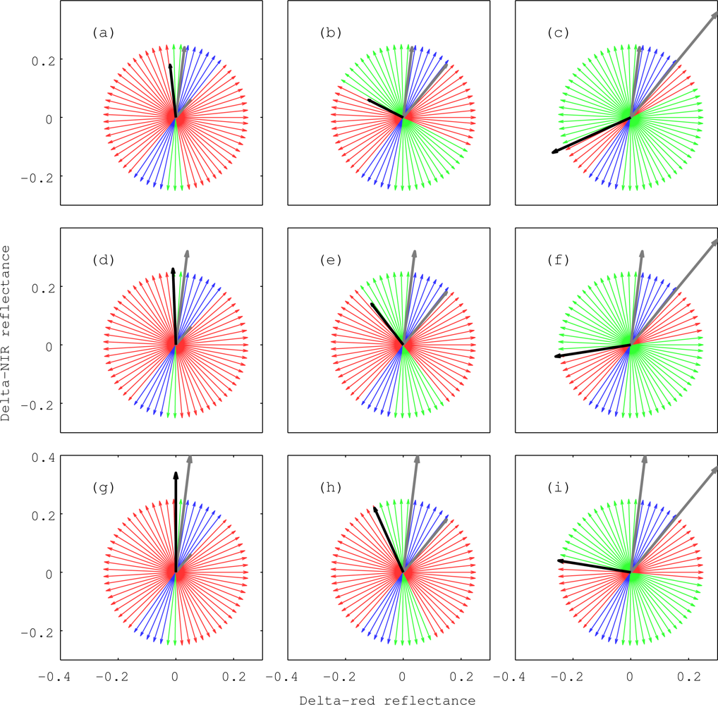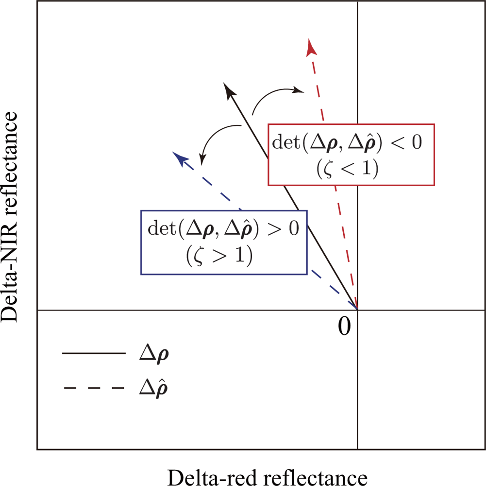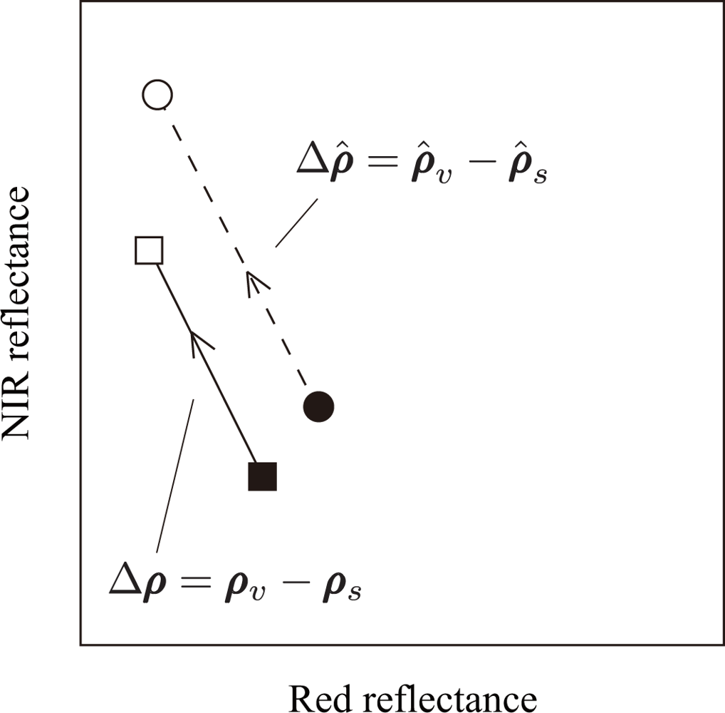 Equation (24) indicates that a vector spanned by the assumed endmember spectra (Δρ̂) necessarily becomes parallel to the vector spanned by the true endmember spectra (Δρ), as illustrated in Figure 5. Empty and filled squares represent the true vegetation and non-vegetation endmember spectra, respectively. Similarly, the circular symbols indicate the vegetation and non-vegetation endmember spectra, respectively, assumed in the algorithm.