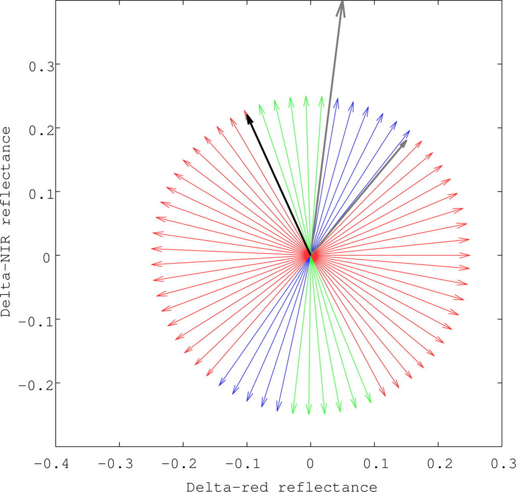 A reflectance spectrum from a target pixel may be represented as a linear sum of the spectra corresponding to a set of representative surface types (endmember spectra) in a LMM. We assume here that a target field consists of vegetation and non-vegetation classes. Red and near-infrared (NIR) bands are considered. Under these assumptions, a modeled spectrum, ρ̂ = (ρ̂r,ρ̂n) (where the subscripts r and n indicate red and NIR spectra, respectively), may be written as