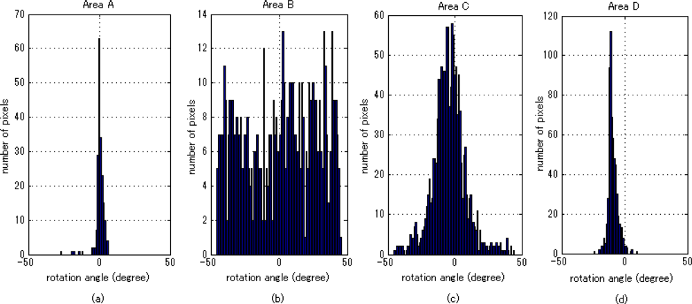 Figure 4 shows rotation angle distribution of selected areas in Figure 2. From left to right, the results from Areas A, B, C and D are shown respectively. Area A is a part of urban area and shows strong double-bounce scattering before applying rotation. Small rotation is observed in Area A. The possible explanation for this is that most urban structures are ideally facing the radar in a way that the double-bounce scattering is mostly observed. Thus, rotation is less necessary here. Area B is a part of mountainous area covered by forests and shows strong volume scattering. In Area B, rotation is randomly distributed across the entire range. Because the phases of cross-polarized components are randomly distributed, angles minimizing them are also randomly distributed. Area C is a part of sea area and mostly shows surface scattering. In Areas A and C, the center of rotation angle distribution is around zero. Finally, Area D is a part of industrial area which shows remarkable change after rotation. Here, the peak of angle shifts is around −10°, which is clearly different from other areas. It coincides with the fact that the structures in Area D are slightly tilted to the right in Figure 3.