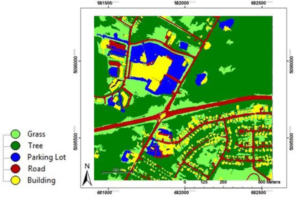 This research presented a novel multisource object-based image analysis framework based on VHR imagery and Spot Height vector data for detailed classification of complex urban environments to five major land cover types consisting of buildings, roads, parking lots, grass, and trees. The framework was developed using the Cognition Network Language available in eCognition software package. The framework consists of multiresolution segmentation followed by hierarchical rule-based classification.