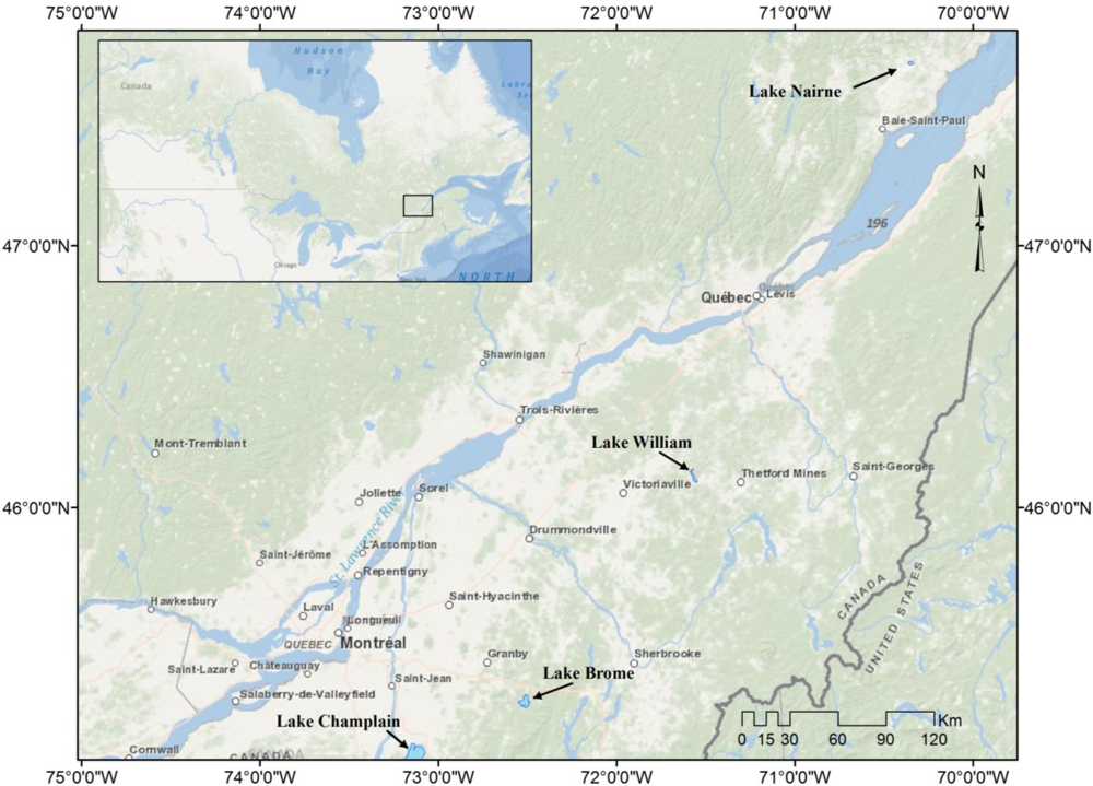 - Laurion, I.; Rousseau, A.; Chokmani, K.; Drogui, P.; Bourget, S.; Warren, A.; Drevnick, P. Mémoire sur la Situation des lacs au Québec en regard des Cyanobactéries; INRS-Centre Eau Terre Environnement: Québec, QC, Canada, 2009; p. 25. [Google Scholar]