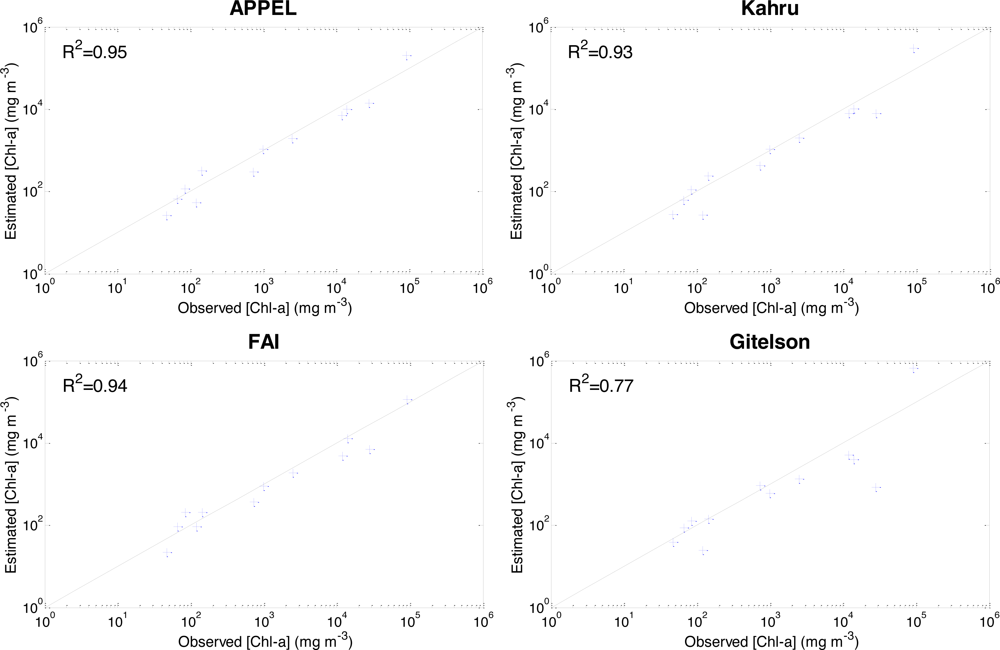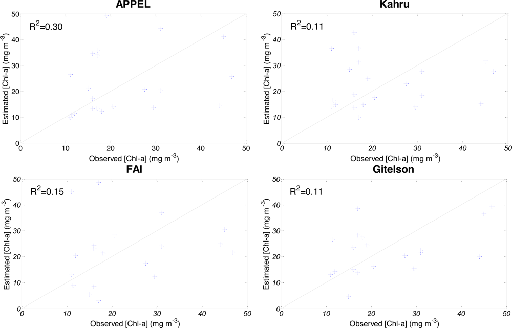 Model performance is much poorer at intermediate concentrations of Chl-a. Table 4 and Figure 10 clearly show the absence of significant correlation between estimated and measured Chl-a for all models except APPEL (R2 = 0.30; Nr = 0.62), with a Nash criterion value close to 0.8, which can be considered to perform acceptably. These results confirm that the error of estimates is mainly caused by low Chl-a values. Water reflectance does not exceed 20% even in heavy bloom conditions. For moderate to low bloom conditions, it is even lower (less than 8%). Consequently, the signal detected in such conditions is more affected by noise. Even under these conditions however, APPEL still has the best performance and the Gitelson-inspired model the worst, while FAI loses much more of its accuracy (Nr decreases from 0.93 to 0.34) than APPEL or Kahru.