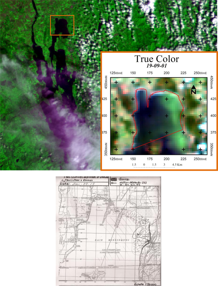 Comparison between true-color image from MODIS sensor and the corresponding field map prepared by the Ministère du Développement Durable de l’Environnement et des Parcs (MDDEP) technicians at Missisquoi Bay on Lake Champlain.