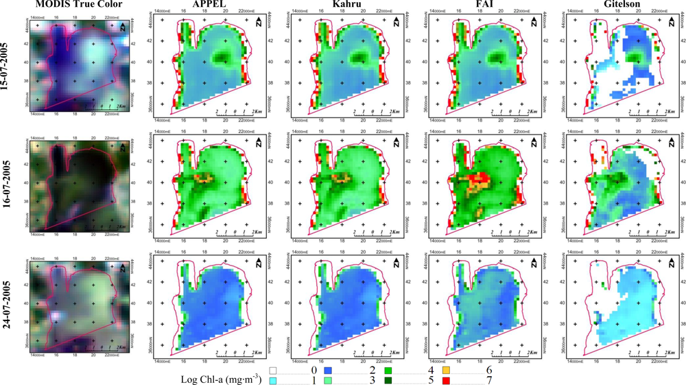 Three semi-empirical algorithms (Kahru, Gitelson, and FAI (Floating Algae Index)) and a novel approach named APPEL (APProach by ELimination) developed at the remote sensing laboratory of the Institut National de la Recherche Scientifique (INRS), Quebec, were selected for this study. Many Case-2 water models designed to estimate Chl-a using remote sensing data are already in use [11,38,39], but most rely on the typical signal of Chl-a near 700 nm, which is not covered by the first seven bands of the MODIS sensor (Table 1). The MODIS bands originally designed for ocean color studies, which do cover 700 nm, are at 1-km spatial resolution, which is not suitable for small and medium-sized water bodies. The purpose of the present study is to assess the potential of the first seven MODIS bands to estimate Chl-a at 250-m spatial resolution. These bands do not cover the frequency of maximal Chl-a absorption, but their better spatial resolution might compensate for their lack of spectral resolution. This assumption is supported by several studies [40–42]. Although originally designed for land studies and cloud detection, by comparison to sensors such as Landsat-7 ETM+, CZCS (Coastal Zone Color Scanner) and SeaWiFS, the MODIS 250 m and 500 m bands have potential for water applications as they are 4–5 times more sensitive than L7/ETM+ bands, nearly twice as sensitive as the corresponding CZCS blue-green bands, and 3–4 times more sensitive than the red and NIR ones, while they are only 1–2 times (500 m, blue-green) less sensitive than the corresponding SeaWiFS bands [19].