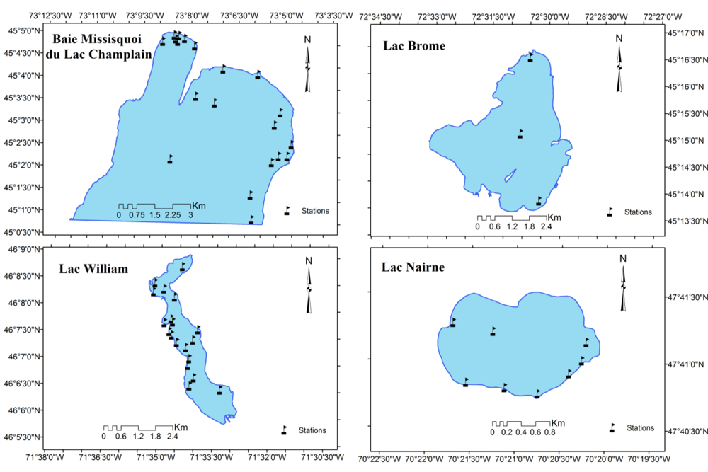 Four lakes were considered in this study: Missisquoi Bay of Lake Champlain, Lake Brome, Lake William, and Lake Nairne, with surfaces of 45, 41, 4, and 2 km2, respectively (Figure 1). These lakes are part of a program to monitor water bodies with recurrent cyanobacterial blooms carried out by the Ministère du Développement Durable de l’Environnement et des Parcs (MDDEP). The data were collected over a period of 9 years (2000 to 2008) at several sites on the four lakes (Figure 2) and included cyanotoxins (equivalent total microcystin-LR and anatoxin-a), algal pigments (Chl-a, pheophytine-a), phytoplankton abundance, and physicochemical characteristics of lake water (total phosphorous, total nitrogen, pH, turbidity, Secchi depth, surface temperature).