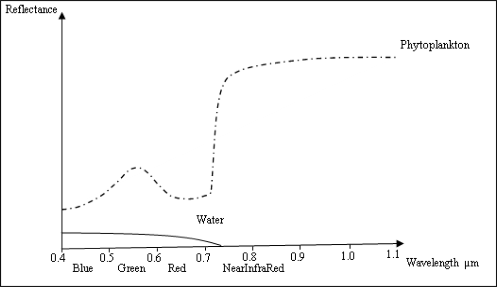 Simplified reflectance spectra of water and phytoplankton (obtained from http://www.a-a-r-s.org/acrs/proceeding/ACRS1994/Papers/AGS94-5.htm).