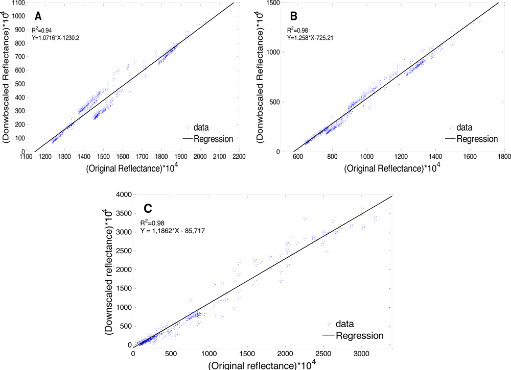 Correlation between the original and the downscaled reflectance used in the estimation models of chlorophyll-a concentration. (A) Band 3, (B) Band 4, and (C) Band 5.