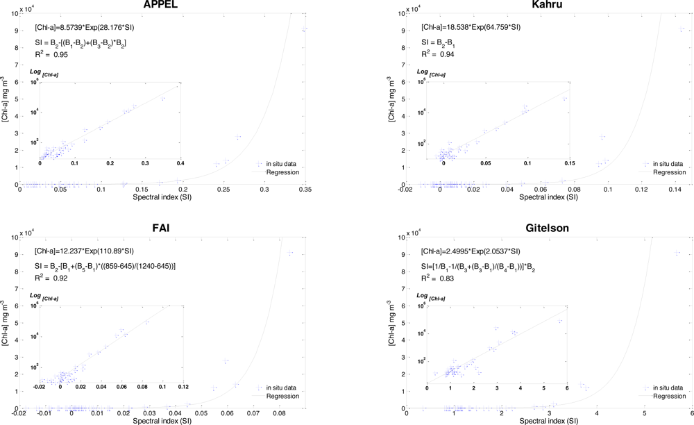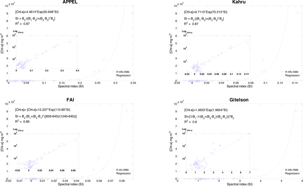 Exponential regression obtained between chlorophyll-a concentration (>10 mg·m−3) and the outputs of the MODIS reflectance bands for the four models (y-axis of inserts is on a logarithmic scale).