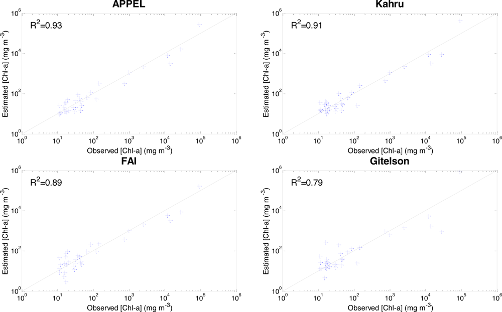 Tables 3 and 4 summarize the performance of the models at Chl-a values above 50 mg·m−3 and between 10 and 50 mg·m−3, respectively. In general, the performance indexes calculated for the high concentrations (Chl-a > 50 mg·m−3) show better results than those calculated for the models calibrated with all Chl-a > 10 mg·m−3, except for the Nash criterion, which shows a slight decrease in the precision of models at the high concentrations. This may be due the smaller size of sample used in this step (N = 12). Figure 9 and 10 show the scatter plots of the observed and estimated (cross-validation) Chl-a values greater than 50 mg·m−3 and between 10 and 50 mg·m−3, respectively. It is clear that the correlation is much more significant in heavy bloom conditions (Figure 9). The improvement in performance is not large for APPEL, Kahru, and the Gitelson-inspired model (Table 3), but for the FAI model, performance improves a lot when using only high Chl-a. The RMSEr changes from 119% to 58%, the BIASr from −32% to 4%, the R2 from 0.89 to 0.94, and the Nr from 0.91 to 0.93. This is not surprising since the accumulated cells form scums at the surface of the water, which will improve the accuracy of this model originally developed to monitor floating algae. At these concentrations, FAI performs as well as APPEL, slightly overestimating Chl-a by 1% and 4%, respectively, while the Kahru model underestimates Chl-a by 2%. In contrast, the BIASr of the Gitelson-inspired model remains high and does not reach the performance of the other models even for heavy algal blooms.