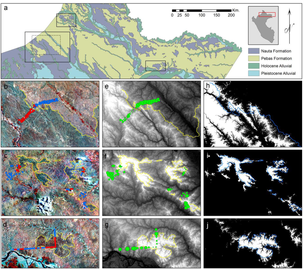 Geological, edaphic, and floristic patterns at three study areas in northern Peru. (a) Geological map for Peru [26], overlaid with the extents of the three study areas: from left to right, Pastaza-Tigre, Curaray, and Sucusari. Solid lines indicate extents of panels (b–j), with exception of panel (h), whose extent is indicated by broken lines. Inset shows location of (a) relative to map of Peru. (b–d) Plant inventories, divided into two groups by clustering analysis (red and blue points), and superimposed upon enhanced and detrended Landsat images for the Pastaza-Tigre, Curaray, and Sucusari study areas, respectively. (e–g) Soil cation concentrations superimposed upon Shuttle Radar Topography Mission (SRTM) digital elevation data, where the diameter of the circles is proportional to the sum of the concentrations of four cations (Ca, Mg, Na, and K). Lighter tones in the SRTM data indicate higher elevations; order of panels is as in (b–d). (h–j) Results of simple classification of SRTM data, where white pixels are above the elevation threshold and black pixels are below the elevation threshold; order as in (b–d). Yellow lines in (b–g) and blue lines in (h–j) indicate manual interpretations of Landsat imagery.
