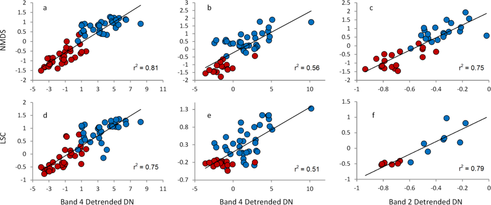 Scatterplots for selected regressions in Tables 1 and 2. Plots depict the relationship between either detrended band 4 or detrended band 2 of Landsat data (measured by detrended digital numbers, ‘DN’), and either the main floristic gradient (measured by a single nonmetric multidimensional scaling axis; ‘NMDS’) or the soil cation gradient (measured as the log-transformed sum of the concentrations of Ca, Mg, Na, K; ‘LSC’), for three study areas in northern Peru. Points represent individual sites, and are colored according to clustering memberships in Figure 1. (a) and (d) Pastaza-Tigre study area. (b) and (e) Curaray study area. (c) and (f) Sucusari study area. (a–c) Correspond to results from Table 1. (d–f) Correspond to results from Table 2. R2 values for each regression are indicated in the bottom-right of each panel.