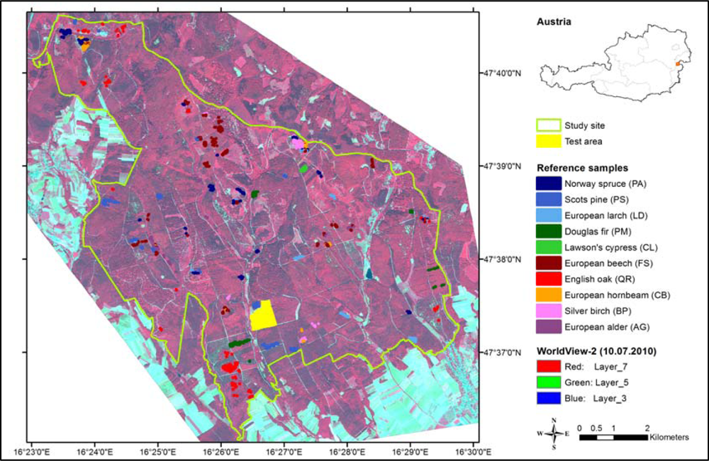 In some recently published studies on tree species mapping with WorldView-2 data, promising results have been obtained [–]. However, studies in European forests are still missing. Therefore, for the present study an area located in Austria was chosen to test the suitability of WorldView-2 for tree species mapping. The area is ideally suited for this purpose, as it is very rich in tree species compared to other European forest biomes, such as boreal forests.