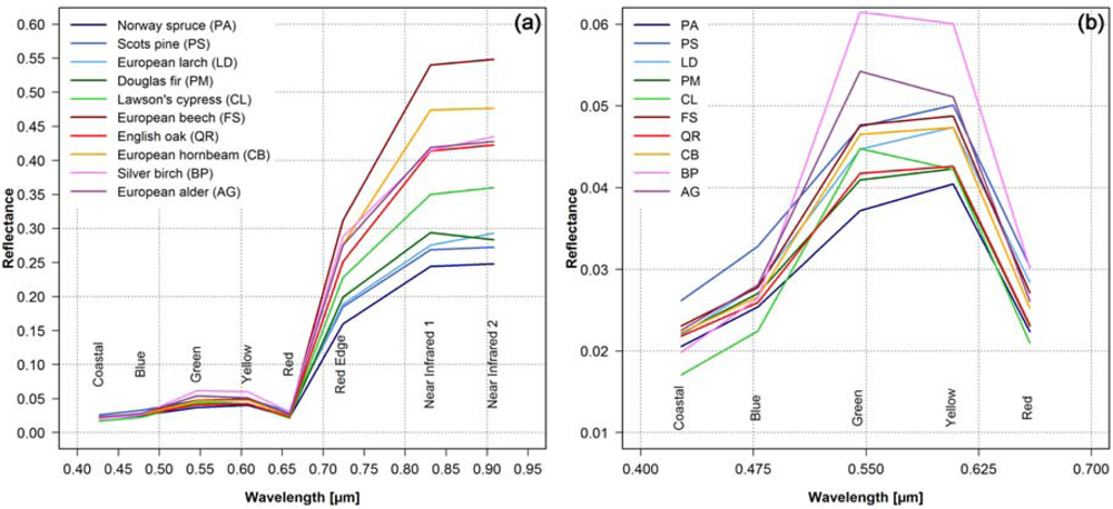 Mean spectral signatures of the 10 tree species derived from the 8 WorldView-2 bands using the reference polygons (for sample size see Table 1): (a) full spectrum, and (b) wavelength range of visible light (detail of the full spectrum).