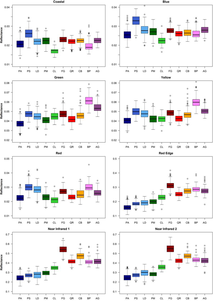 Box-whisker-plots of median reflectance values of the 8 WorldView-2 bands for the 10 tree species derived from the reference polygons.