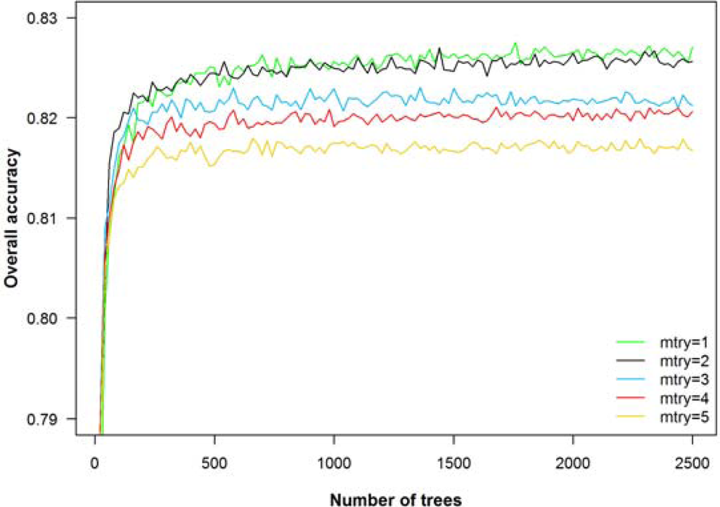 Effect of the number of trees and the number of random split variables at each node (mtry) on the overall accuracy for the object-based RF classification of 10 tree species using the 8 bands of WorldView-2 (mean overall accuracy from 20 repetitions).