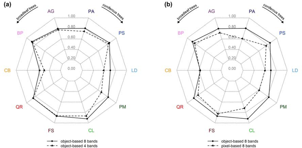 Spider charts representing the user’s accuracies for the following classification approaches (RF, 10 tree species): (a) 8 versus 4 bands (object-based), (b) object-based versus pixel-based (8 bands).