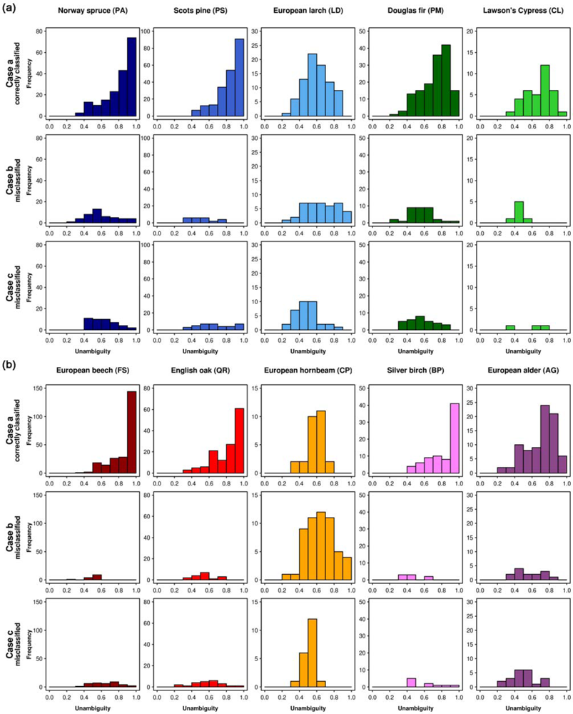 Three cases of validation outcome can be distinguished (Table 3). We computed the unambiguity for each reference sample and from this we derived for each case (a, b, and c) and for each tree species the distribution of unambiguity. This information can, for example, be used for locating outliers in the reference dataset. Samples that are misclassified with a high unambiguity (case b or c) are outlier candidates and should be verified.