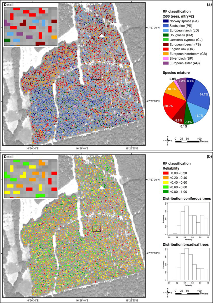 Tree species diversity is a key parameter to describe forest ecosystems. It is a relevant parameter for various ecological issues such as wildlife habitat modeling and it is also becoming more and more important in sustainable forest management [–]. For example, in close-to-nature forest management pure stands are replaced by heterogeneous, mixed stands. Hence, spatially detailed tree species information is of high importance. Traditional forest inventories and other field-based data acquisition methods, such as stand estimation, are not suitable for such tasks. It is nearly impossible to acquire detailed tree species information over large areas purely on the basis of field assessments. Therefore, enhanced methods are required to get spatially-explicit information on the tree species composition and distribution patterns.