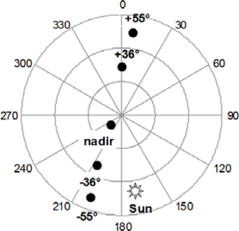 39]. The presence of shadows in the canopy forms an important argument for exploring pointable data because the shadowing effect in vegetated surfaces will result in enhanced reflectance in the backscatter direction and reduced reflectance in the forward scatter direction of the principal plane [