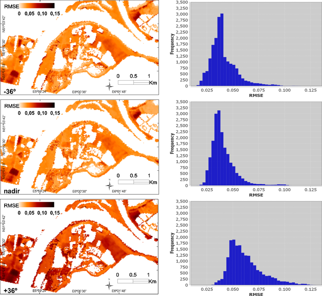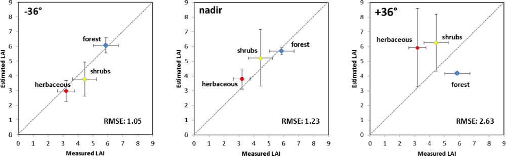 New methods are required to automate and streamline the time-consuming process of flow resistance calculation caused by vegetation in river floodplains. Deriving leaf area index (LAI), a proxy of vegetation density that can be quantified from space, holds promise for that purpose. Pointable imaging spectrometers possess advanced capabilities to derive LAI under a preferred viewing angle. A methodology for mapping LAI has been developed on the basis of inverting the ray tracing model FLIGHT against pointable CHRIS images, thereby taking the plant structural characteristics of different vegetation classes into account. The approach was applied to a heterogeneous river floodplain area that grades from semi-natural grasslands towards shrub and tree encroachments. The CHRIS nadir image was first classified into three distinct vegetation classes (‘herbaceous’, ‘shrubs’, ‘forest’) that formed the basis for class-based model inversion. By configuring FLIGHT per vegetation class, a more accurate representation of the heterogeneous nature of a river floodplain can be achieved, i.e., ‘herbaceous’ and ‘shrubs’ were simulated in 1D mode while ‘forest’ was simulated in 3D mode. LAI values were subsequently pixelwise and class-based derived through model inversion, and this was carried out for each view zenith angle (VZA: nadir, ±36°) separately. LAI retrievals matched best with validation data at −36° backscatter direction (RMSE: 1.05), which is the viewing angle that was positioned near to the solar position, closely followed by nadir VZA (RMSE: 1.23). Most LAI variability was observed in these two viewing angles. This suggests that in the absence of pointable observations nadir-based observations would be perfectly appropriate for vegetation density monitoring applications. The forward scatterer +36° VZA led to considerably poorer retrievals (RMSE: 2.63) and is not recommended to be used for quantifying vegetation density. The herein proposed methodology has been implemented in a software package ARTMO; thereby, LAI maps over larger areas were generated in a semi-automatic way, while at the same time the heterogeneous nature of the landscape and the viewing configurations of the sensor have been properly interpreted. This approach opens floodplain monitoring opportunities in view of upcoming operational sensors with pointing capabilities such as EnMAP and VENμS.