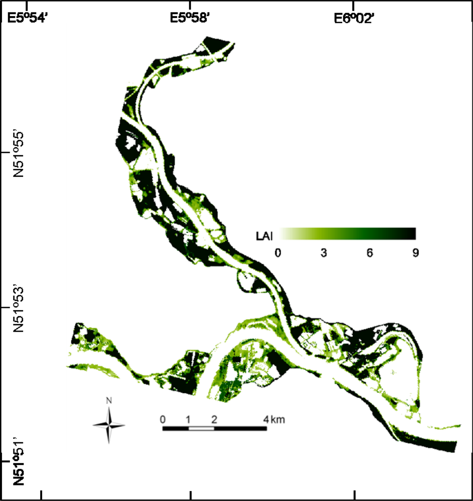 18]. The latter author linked LAI with cross-sectional flow velocity, flow depth and plant height to calculate the friction factor for flow inside leafy and woody vegetation on floodplains and wetlands. Implementing spatially-explicit LAI estimates in flow resistance calculation schemes may therefore bypass the need for many elaborative field measurements [