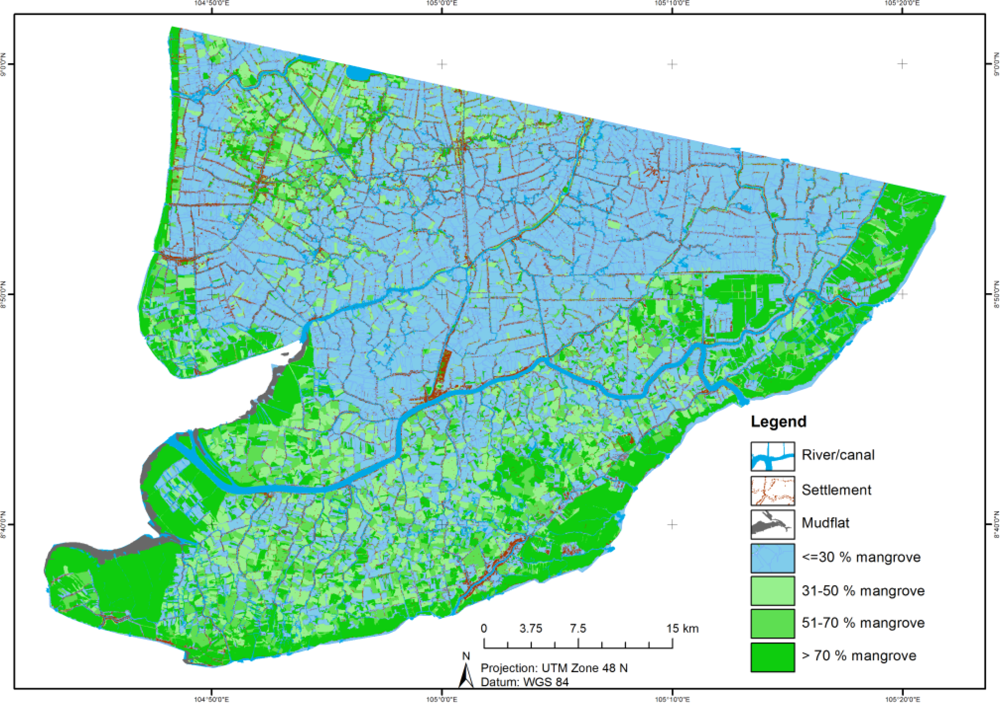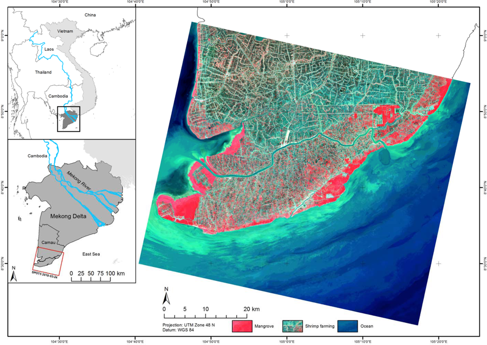 As outlined above, most applications related to mangrove mapping usually focus on the discrete differentiation between mangrove and non-mangrove areas or on the qualitative assessment of species, growth status, or condition to derive classes such as “dense” or “sparse” mangrove forests. The mangrove ecosystem of Ca Mau in the Mekong Delta (MD), however, is characterized by a very special integrated farming system consisting of mixed aquaculture farming and mangrove cultivation, with governmental guidelines on the exact share of mangrove forest that a farmer should maintain on his land. Against this background, the current study presents an object-based classification approach that allows the quantitative estimation of mangrove fractions within the aquatic shrimp farming system of Ca Mau province in the MD.