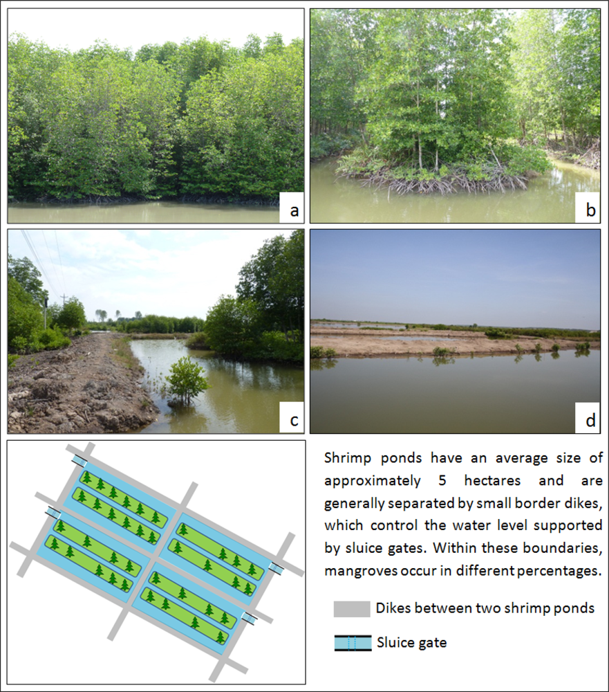 Examples of different mangrove cover and schematic sketch of an integrated shrimp-mangrove farming system: (a) dense mangrove, more than 70%; (b) less dense mangrove forest: density 50% to 70%; (c) mixed mangrove and shrimp farming: density 30% to 50%; and (d) shrimp farming with less than 30% mangrove. (Source: own photographs, 2011).