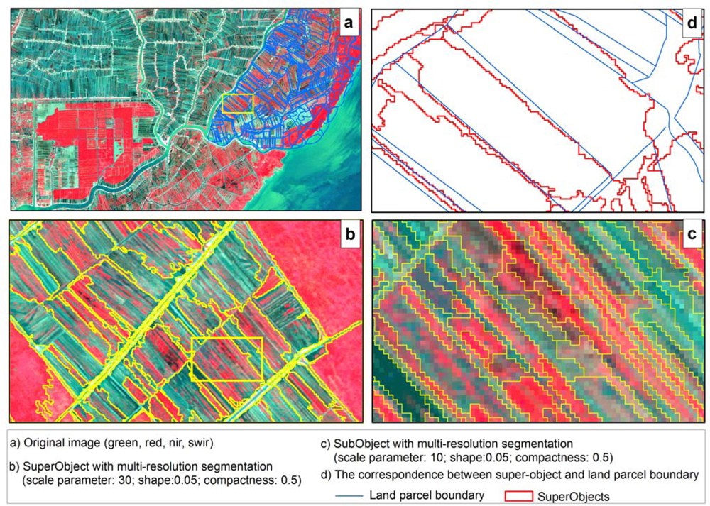 The most important and most critical aspect of this approach is the parameterization of the coarse segmentation layer so that each shrimp pond is represented by an individual object. Therefore, the different parameters were tested systematically by comparing the resulting objects with a cadastral map that was available for a small test case area (Figure 4). Starting with a low scale parameter, the threshold was increased until the super-objects had an average size that corresponded to the mean shrimp pond size of approximately five hectares (scale parameter = 30, shape = 0.05, and compactness = 0.5). The parameters for the second segmentation level were defined so that the resulting objects represented the smallest isolated mangrove forest patches within the shrimp pond areas (scale parameter = 10, shape = 0.05, and compactness = 0.5).