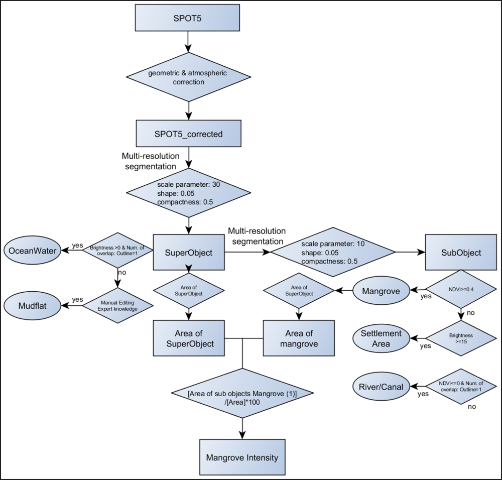 At the super-object level, the ocean water was separated from land based on the object feature “brightness” (brightness > 0, number of overlapping pixels = 1), the threshold of which was defined using an administrative map available for the area. The mud flat class was manually edited using expert image interpretation. At the sub-object level, settlement areas were identified based on the object feature “brightness” (brightness ≥ 15), and rivers and canals were classified by applying an NDVI threshold (NDVI ≤ 0, number of overlapping pixels = 1). Mangrove patches within the super-objects were classified using an NDVI threshold of 0.4.