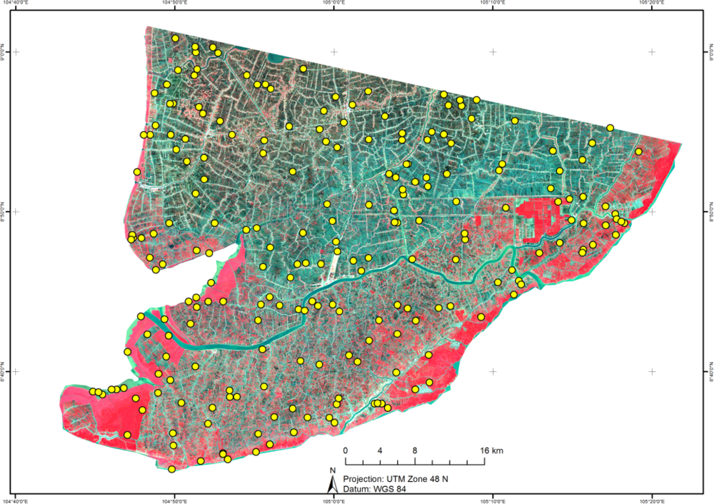 Accuracy assessment is an important part of the image classification procedure and can be computed by assessing either positional or thematic accuracies. Positional accuracy is defined as the accuracy of the location of a point in the satellite imagery with reference to its location on the ground, whereas thematic accuracy is the accuracy of a mapped land cover class at a certain time compared with what was actually on the ground at that time [63]. In this study, a total of 222 reference points were surveyed in the field to serve as validation samples for the classification (Figure 6). The number of validation samples selected for each class was proportional to its importance in terms of area covered, with a minimum of 10 samples for each class. At each reference location, the respective land cover class and mangrove density within a farmer’s parcel were visually estimated, and GPS coordinates were recorded. Each land cover class was then compared with the results of the classified image. A confusion matrix together with descriptive statistics (user’s accuracy, producer’s accuracy and overall accuracy) was then computed to conduct an accuracy assessment for the land cover classification.