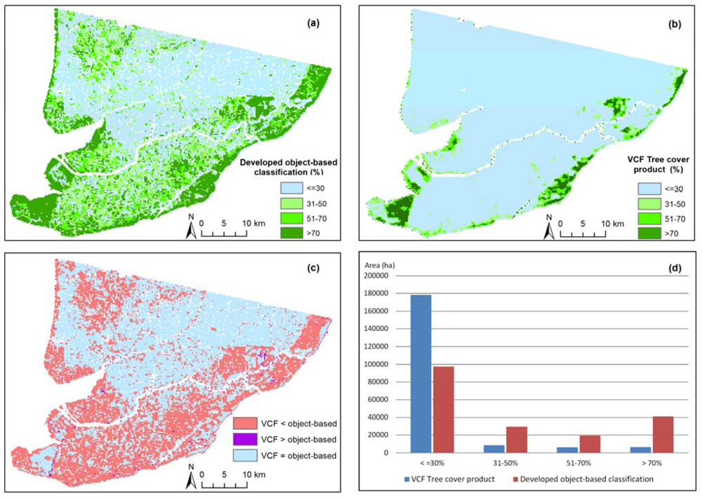 (a) Developed object-based classification result derived from SPOT5, (b) VCF tree cover product derived from MODIS, (c) spatial agreement between two products, and (d) comparison between the two products in the area.