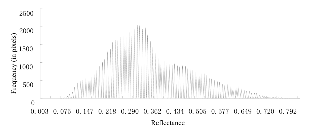 The 1,030 nm wavelength in the hyperspectral images corresponded to the Hyperion band 89 (1,033.5 nm). The mathematical statistics of the Hyperion imagery after atmosphere correction showed that the maximum value was 0.825 and that the average value was 0.346. The standard deviation was 0.135. Figure 10 contains the image histogram statistics.