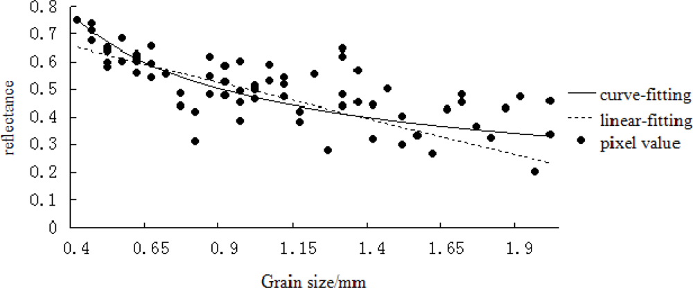Figure 11 indicates the relationship between the pixel value of the Hyperion band 89 after atmospheric correction and the snow grain size. Linear fitting and curve fitting of the pixel value and grain size led to the following relationships, respectively: ρ = −0.26R + 0.67, where ρ is the reflectance, R is the snow grain size. The correlation coefficient r of the fitting line was 0.81. ρ = 0.47R−0.51, the correlation coefficient r was 0.84. The root mean square error (RMSE) was 0.24 mm and 0.21 mm for the linear fitting and curve fitting, respectively. These results indicate that the pixel value had an index function and a linear relation with the grain size.