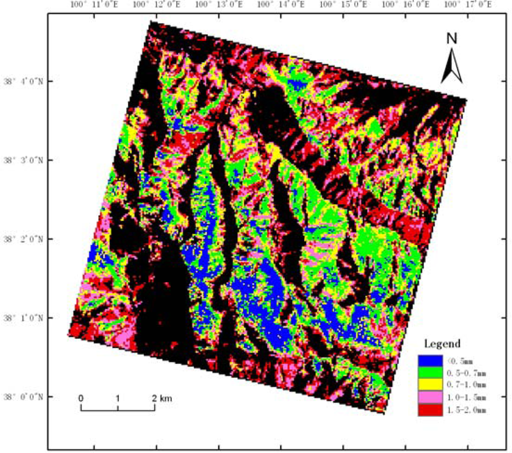 We assumed that the snow’s water content was proportional to the movement of the spectrum absorption valley and that the location reflected the water content of the snow. Using models of the snow reflectance and snow grain size in band 89 will result in large errors. For the 2,554 pixels that had spectrum absorption-valley movement, we could replace the assumed snow-reflectance wavelength with the new one. Figure 14 shows the new distribution of the snow grain size. These abnormal pixels were affected by both the snow humidity and grain size. The relationship between the reflectance and snow characteristics was not a simple linear or exponential relationship, and there were no measured data. The estimation accuracy of the method requires further study.
