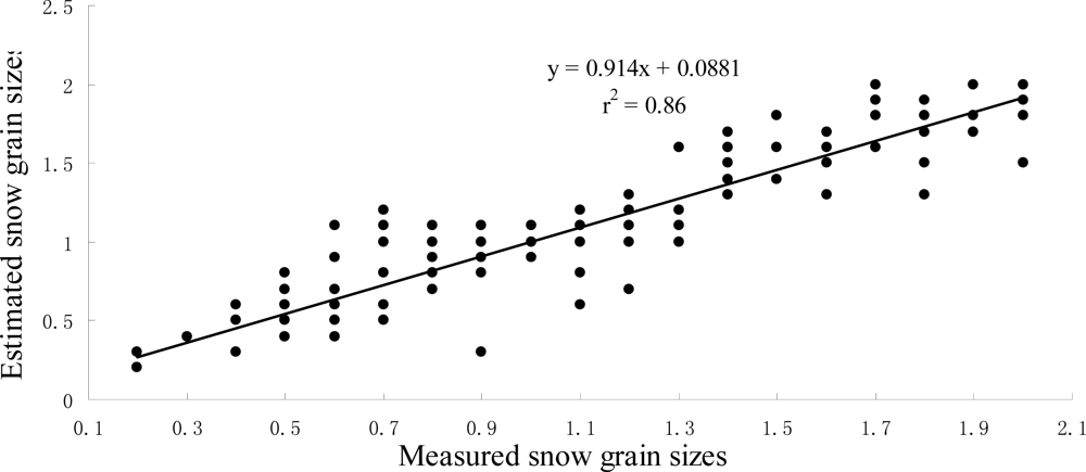 where yi is the measured value, ŷ is an estimated value, and n is the number of samples. The RMSE were 0.14 mm and 0.12 mm for the linear model and the exponential model, respectively. The linear relationship between the estimated and measured snow grain sizes was calculated and shown in Figure 15. The linear relationship coefficient r2 is 0.86. The kappa coefficient of the estimate accuracy was calculated (Table 1).