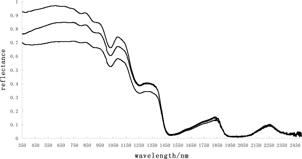 The ratio of snow to whiteboard-radiation brightness can be evaluated as the snow reflectance. Figure 5 shows the snow spectral reflectance sampled in the Binggou watershed. The snow reflectivity in the visible light region was relatively high, normally between 0.6 and 0.95 (Figure 5). The value decreased rapidly in the near-infrared region. Four absorption valleys appeared near 1,030 nm, 1,250 nm, 1,470 nm, and 2,000 nm. However, the value of reflectivity was almost zero near 1,470 nm and 2,000 nm, and the types of snow showed very small differences between these two wavelengths. Thus, to find the band that is sensitive to snow-particle size, one should focus on the near-infrared region, of which the corresponding bands in the Hyperion hyperspectral imagery could not be easily affected by water vapor, atmospheric scattering or attenuation.