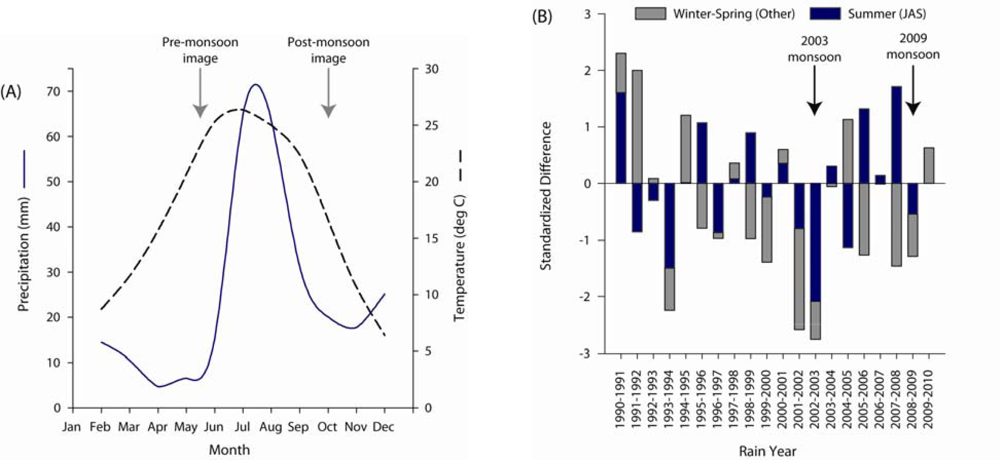 Climatic patterns for the Malpais Borderland Area calculated using data from five NOAA meteorological stations from 1990 through 2010. Panel (A) depicts the mean monthly precipitation (solid blue line) and temperature (black dotted line); gray arrows indicate the temporal range of Landsat TM 5 imagery used in this study. Panel (B) is a standardized difference from long-term average calculated seasonally based on standard water year (October through September). In this region, the growing season (July, August, and September; Panel (A)) occurs at the end of the water year.