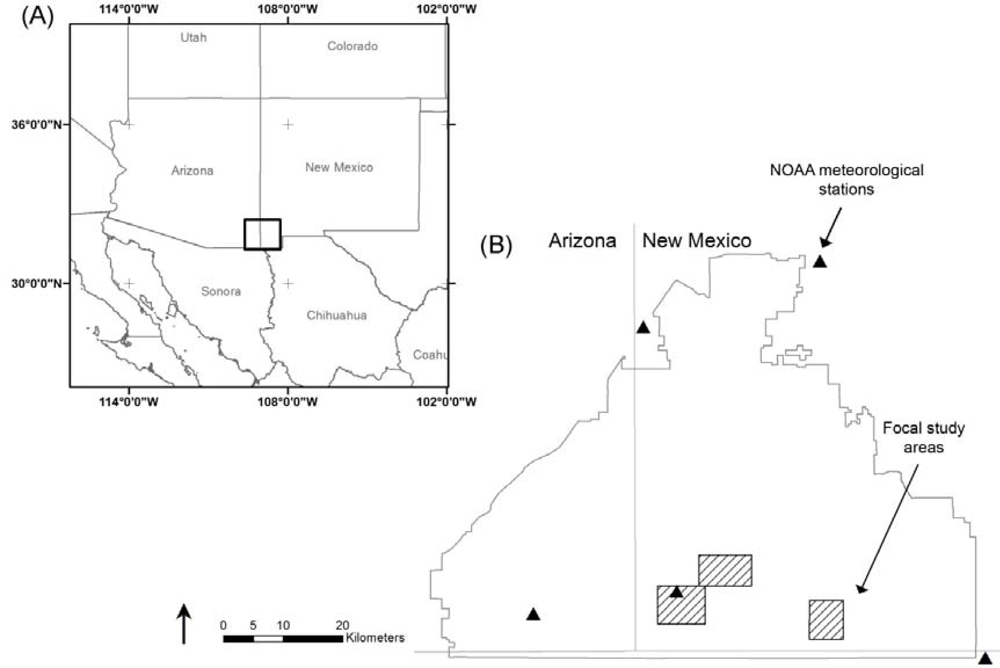 (A) Location of 324,000 ha Malpais Borderland study area in southwestern USA. (B) Meteorological stations within 2 km of the study site and three focal areas for which ecological states were mapped (hatched polygons) are presented in Panel (B).
