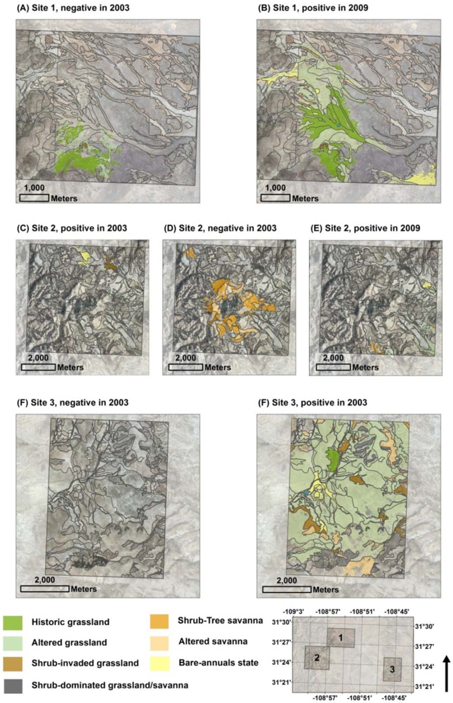 Distribution of ecological states (gray outlines) within areas demonstrating NDVI growing season anomalies (A) Site 1, negative change in 2003; (B) Site 1, positive change 2009; (C) Site 2, positive change in 2003; (D) Site 2, negative change 2003; (E) Site 2, positive change, 2009; (F) Site 3, negative change in 2003; (G) Site 3, positive change 2009. Gray outlines depict ecological state boundaries prior to grouping.