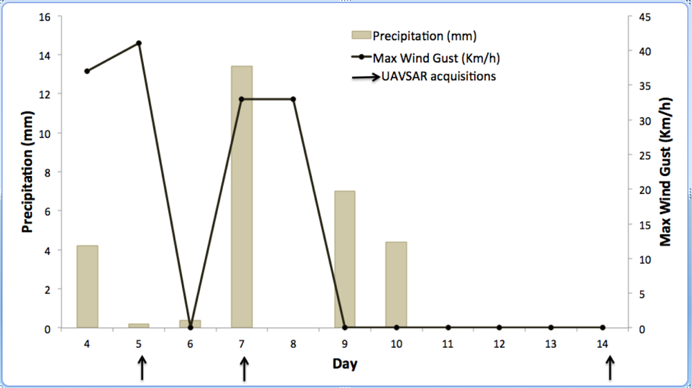 | Acquisition Day (2009) | UAVSAR Pair | Temporal Baseline |