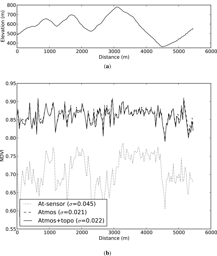Transect of NDVI through homogeneous forest with along-transect variation in topography. Transect is shown against imagery in Figure 11. (a) Elevation; (b) NDVI calculated from reflectances which are either at-sensor, atmospherically corrected, or atmospherically and topographically corrected. Standard deviation (σ) shown for each line.