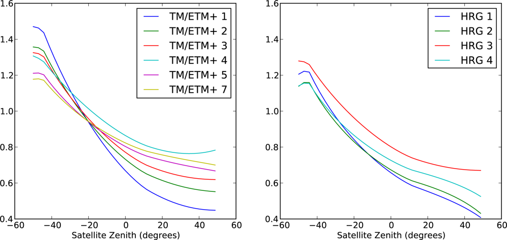 Shape of relative BRDF function (Equation (14)), for the parameters given in Table 7, for each band of Landsat (left) and SPOT (right). Lines are through the principle plane (i.e., the sun and satellite lie in the same plane as the surface normal), and the sun zenith angle is 45°.