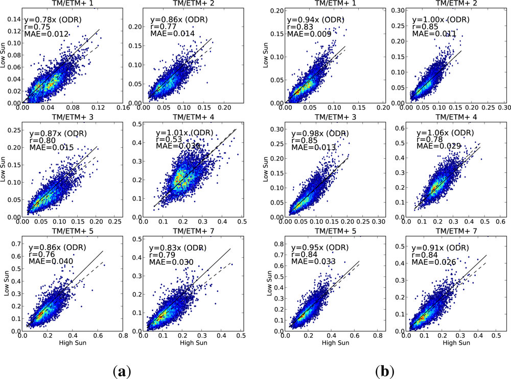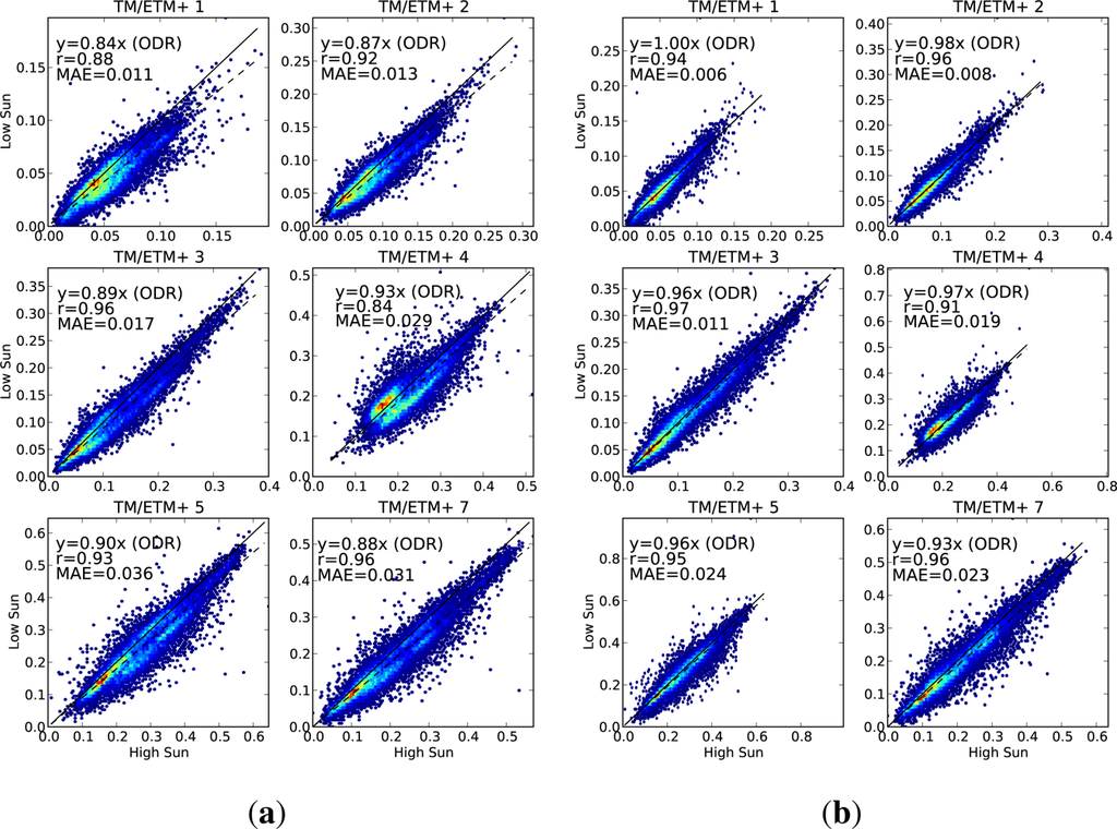 Figure 3 shows the general case of correcting for BRDF on widely mixed terrain, for all 6 reflective bands of Landsat TM/ETM+. Figure 3(a) shows the relationship between reflectance measured at the two different sun angles, and clearly shows a systematic bias to give a lower apparent reflectance when the sun is lower in the sky. This is as one would expect, as the lower sun elevation means that sub-pixel structural elements cast longer shadows, and so the sensor sees more area in shadow. Figure 3(b) shows the effect of correcting for BRDF, with the slope of the regression lines closer to 1, and the correlation also increased. The mean absolute error is reduced in all bands. For the sake of brevity we have not shown the separate analysis of TM and ETM+, as the correction performs in much the same way for both sensors.