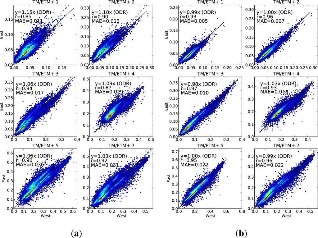 Landsat, case 2. Mixed validation pixels, over a range of orientations, split by view direction. (a) Reflectance from west view against uncorrected reflectance from east view; (b) Reflectance from east view has been corrected to angles for west view.