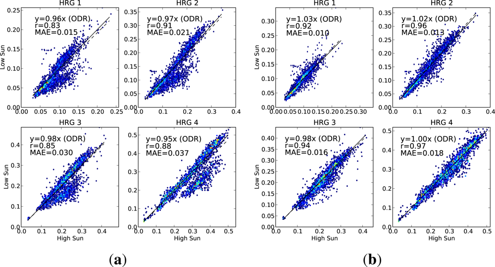 - Case 4. SPOT pixels on a range of orientations, split between high-sun and low-sun observations. Due to a limited number of overlap areas available with a large sun angle difference, other pairs were excluded from these plots (pairs used were those with Δθi > 10° from Table 5). This tests the correction for sun angle change, for the SPOT sensor. Sample size = 2,367 pixels.